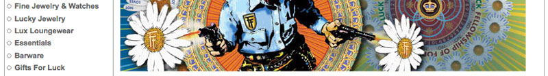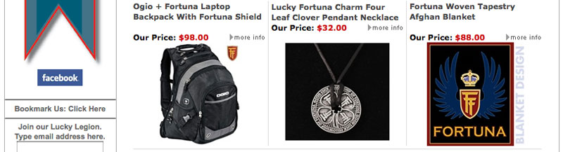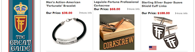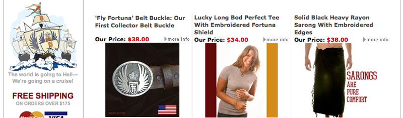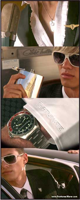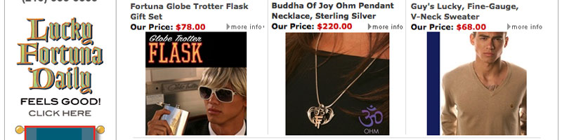 As a part of the sprawling artwork, Fortuna presented an online store with a wide array of branded luxury apparel and accessories, for all price points. Over 150 products were designed and developed. Long before print-on-demand, over 100 lines were manufactured and inventoried. ~ Gordy Grundy