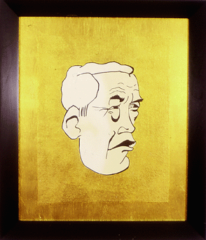 The Artist's Comments: Beautifullyframed in beefy black laquered wood, a cariacature of film director,writer and actor John Huston is set against a field of Gold leaf.