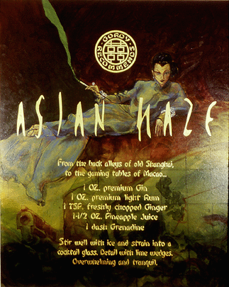 The Artist's Comments: The Los Angeles Times says of this painting, "TheMuni (Los Angeles Municipal Gallery) has the biggest show. Itwas chosen by Connie Butler, an associate curator at the Museumof Contemporary Art. Her choices broadcast an urge to be inclusive.There's also a significant brace of punk-tinged work like GordyGrundy's "Asian Haze" an affectionate send up of theTerry-and-the-Pirates past when hard drinking white guys saw Asianwomen as dangerously sexy Dragon Ladies..." The paintingfeatures a series of hidden visuals such as a couple kissing,a Fu Manchu-like character and maps of the South China seas. Itis very entertaining and beautifully wrought. Artists note: Thispiece is literally heavy with layer upon layer of thin color.It is translucent.