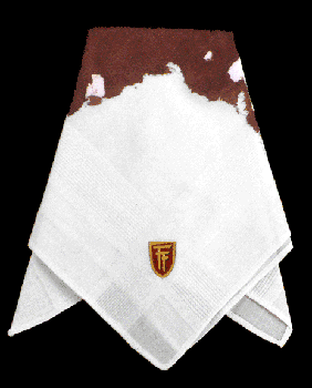 BLOOD SPILLED IN THE NAME OF FORTUNA (LOTUS BAR) 12 x 9 inches; English linen (James Cagney Fold), embroidery, blood